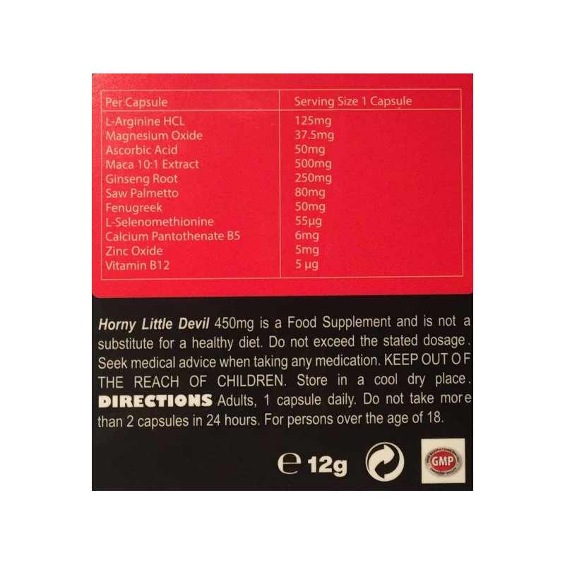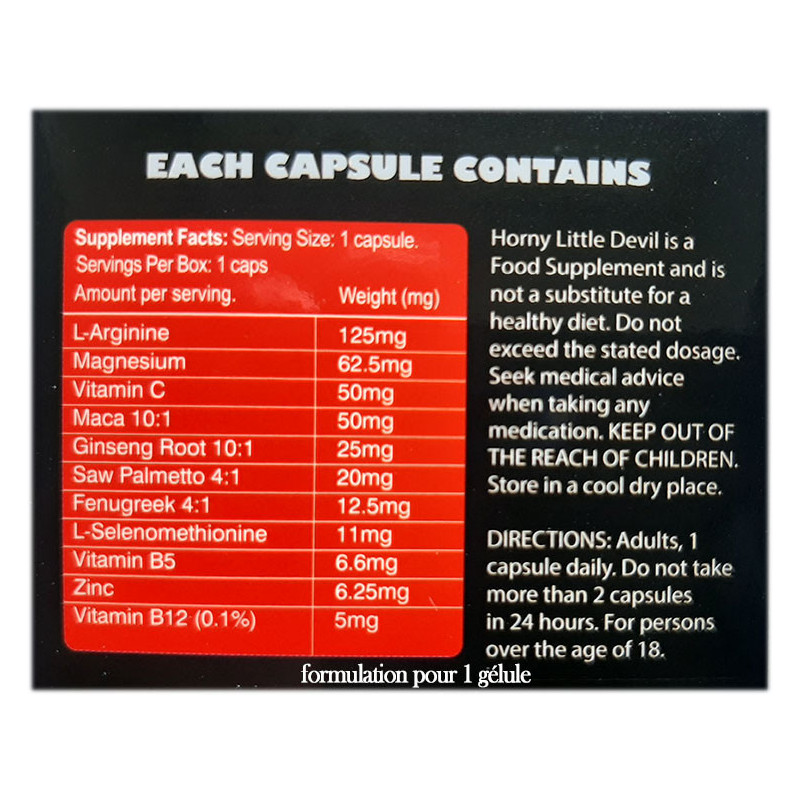 | Composition | L-Arginine HCL: 125mg, Magnesium Oxide, 62.5mg, Ascorbic Acid: 50mg, Maca 10:1 Extract: 50mg, Ginseng Root: 25mg, Saw Palmetto: 20mg, Fenugreek: 12.5mg, L-Selenomethionine 11mg, Calcium Pantothenate B5: 6.6mg, Zinc Oxide 6.25mg, Vitamin B12 5mg Capsule : Gélatine, glycérine, eau, colorants E133 et E171 |